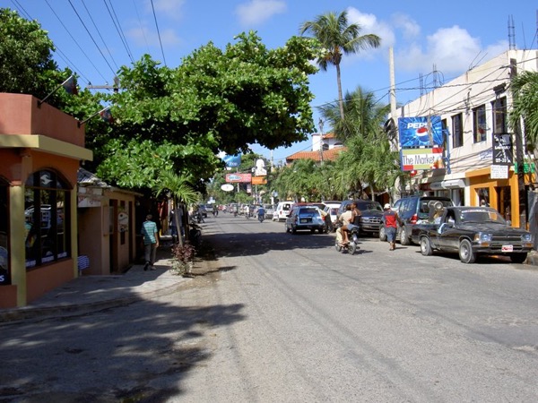 De drukke straat tussen de twee delen van het resort.